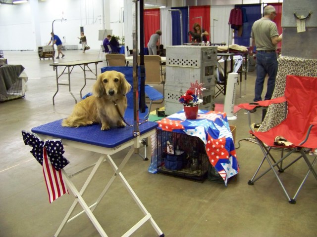 Day 2 started early with grooming and then into the ring. The show is sponsoring a July 4th decorating prize with cash prizes, so why not get in the red, white, and blue spirit?