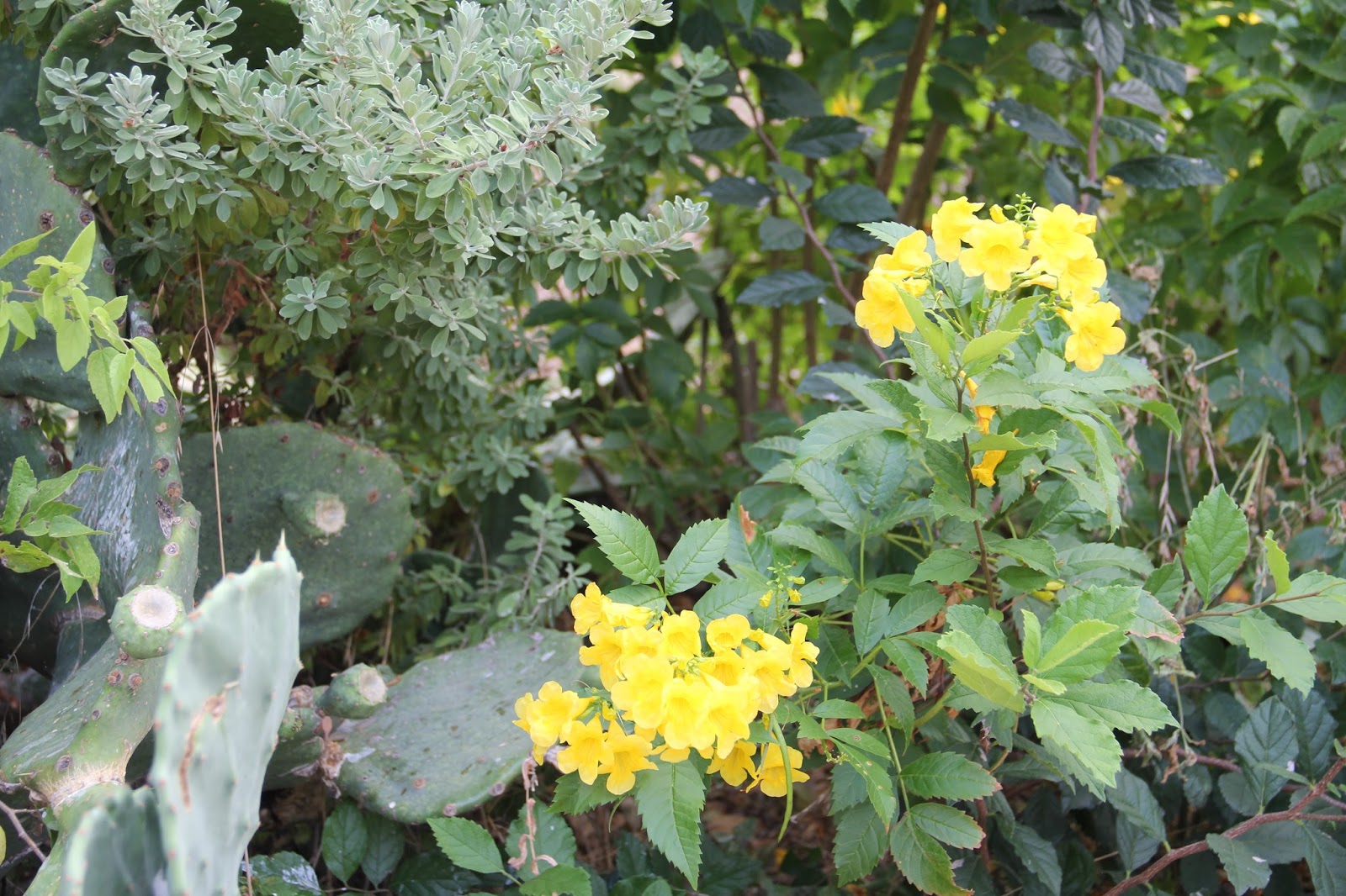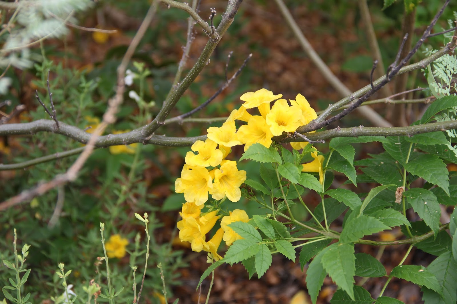 I’m not sure if it was the rains or the return of the drought, but the Esperanzas (Tecoma sans) are profuse this year. I had never noticed how many bushes are in the park, but with their bright yellow blossoms I didn’t miss them this time! This hardy plant is also known as Yellow Bells, but most people around here know them as Esperanzas. I love the way that word flows off my tongue and, best of all, in Spanish it means “hope”.
