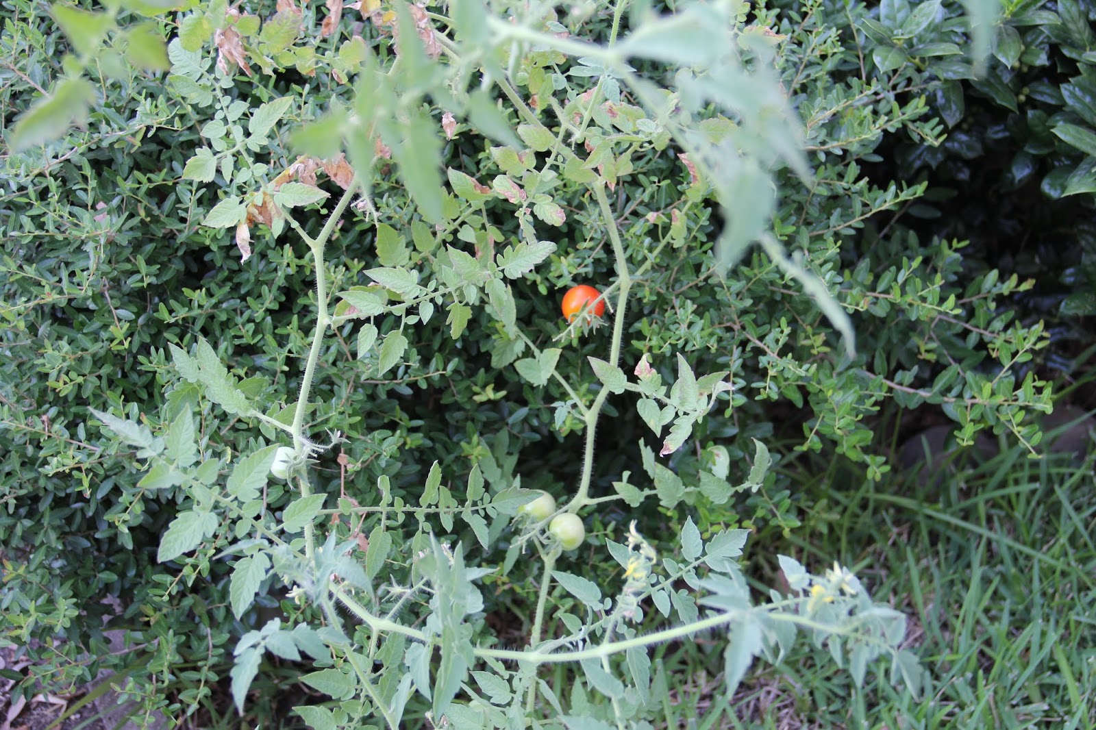 Last night after watering the plants I decided that it was time to pull up the tomato plant. It was still making blossoms, but I knew that realistically it would not set any more fruit. Time to pull it up and let the pot rest until it is time to plant a fall tomato. But the plant gave me two nice surprises before I pulled it up.