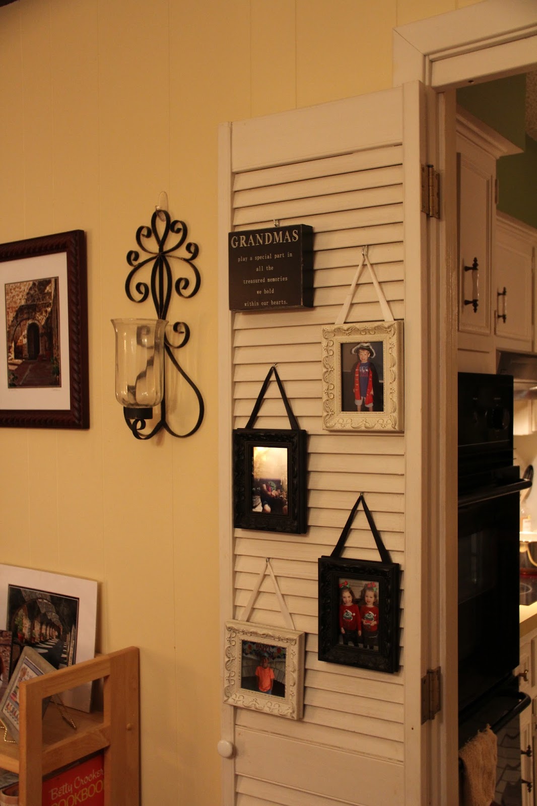 Creativity and inspiration often surprise me when I’m not expecting it. I’ve lived here almost 12 years and I’ve threatened several times to take down these dust catching shutters that are on either side of both doors into the kitchen. I was afraid that if I did the walls and the space would be bare. The shutters frame the doors and give the rooms depth.