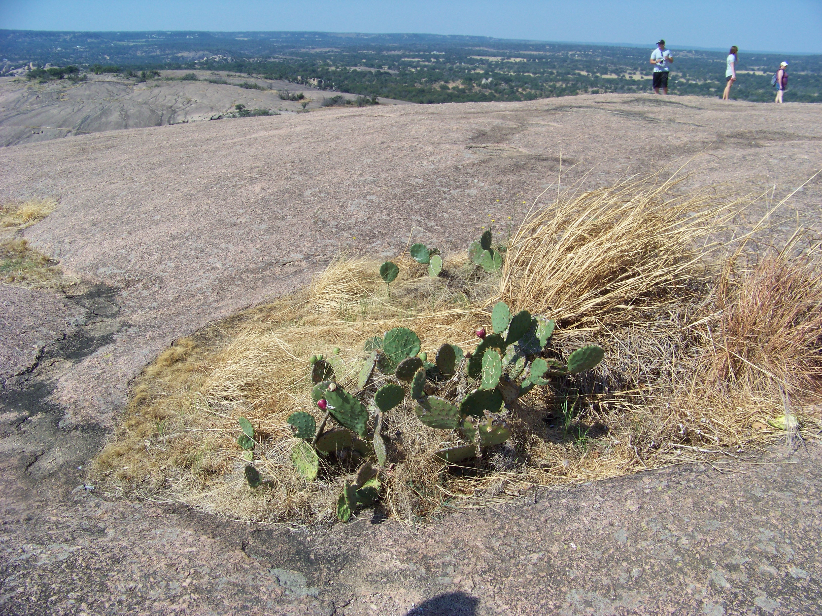 Microhabitats have formed in areas where the granite has worn away faster than the surrounding area.   Yes, prickly pear is every where in Texas!
