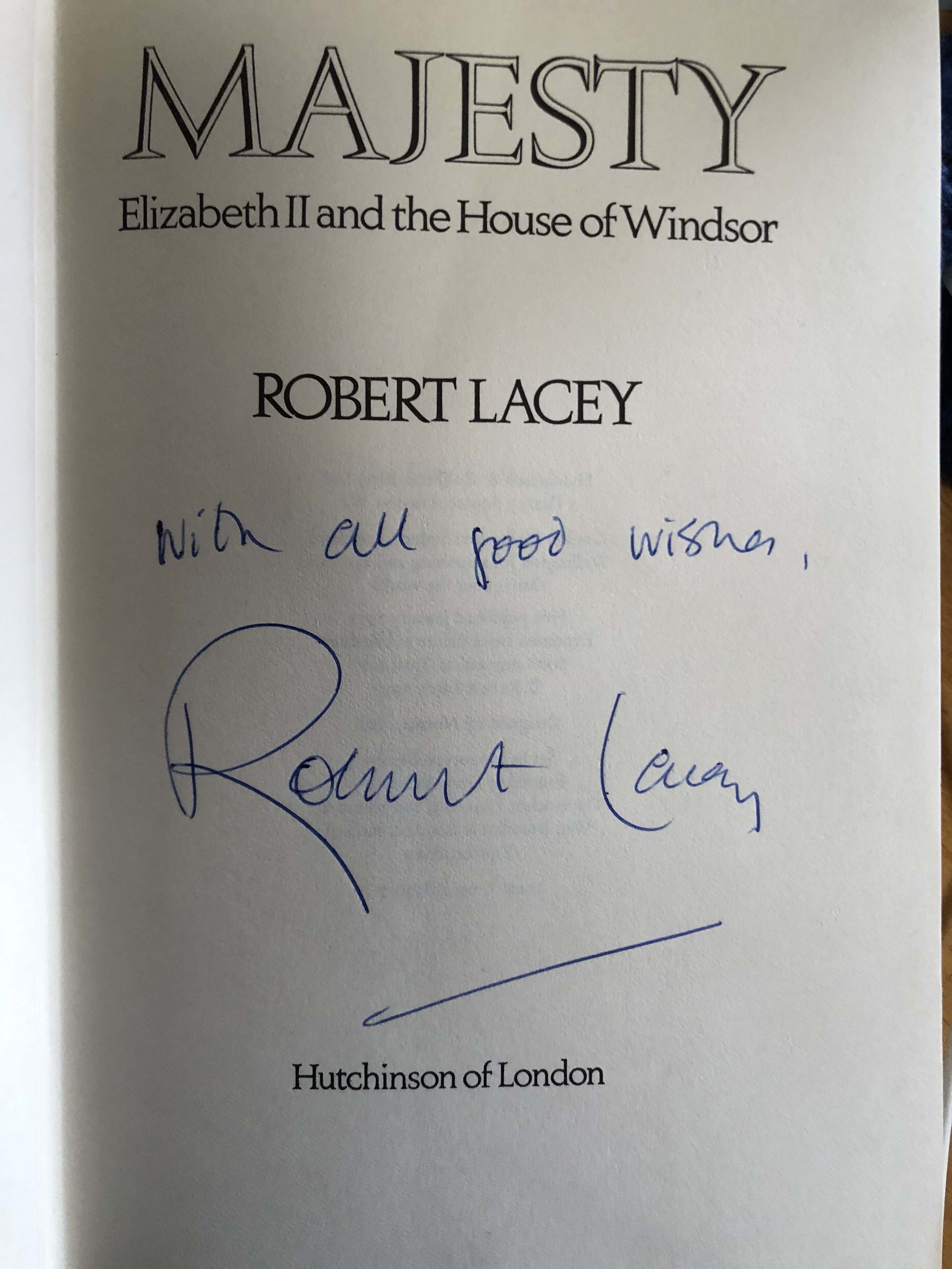 I was pleased to find a whole tub of biography of the British Royal family included in the sale.; biography is my favorite genre and the Royal family is a favorite to read about. Majesty, by Robert Lacey, was one of the books in the tub. I had enjoyed both of his companion books for the Netflix series, The Crown, and I had added this book to my to-read list. I was surprised to find it and even more surprised when I opened it to start reading last night and found that it was an autographed copy!