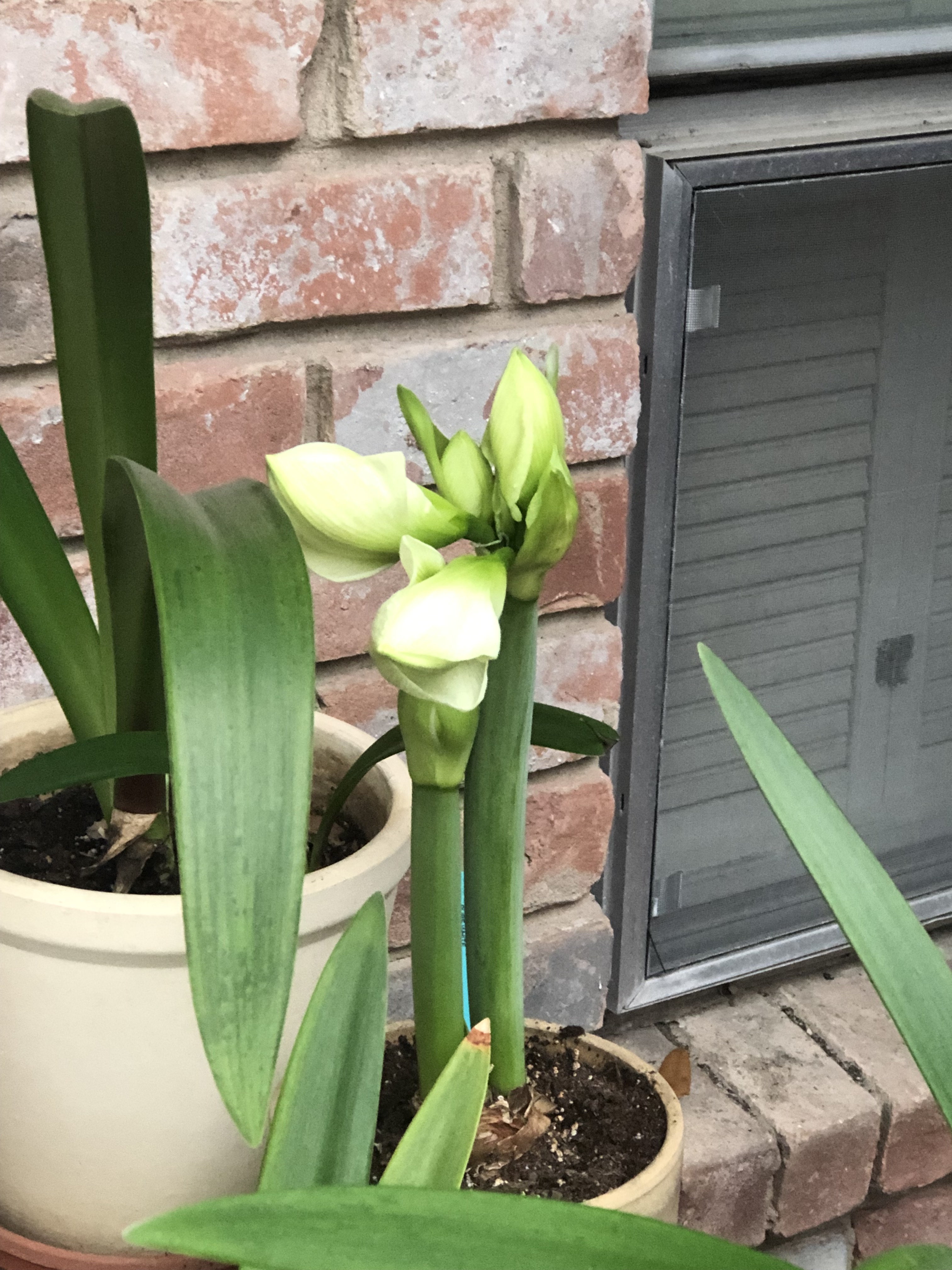 This bulb has been the gift that keeps on giving as the second stalk had four blooms and this morning I realized there is a third stalk forming. I am delighted and the best part is that one of the other two bulbs is blooming (it will get is own post) and the other one has a bud stalk, so I know I will have amaryllis blooms to enjoy for quite a while. And, by then the older bulbs should have buds and the enjoyment will continue.