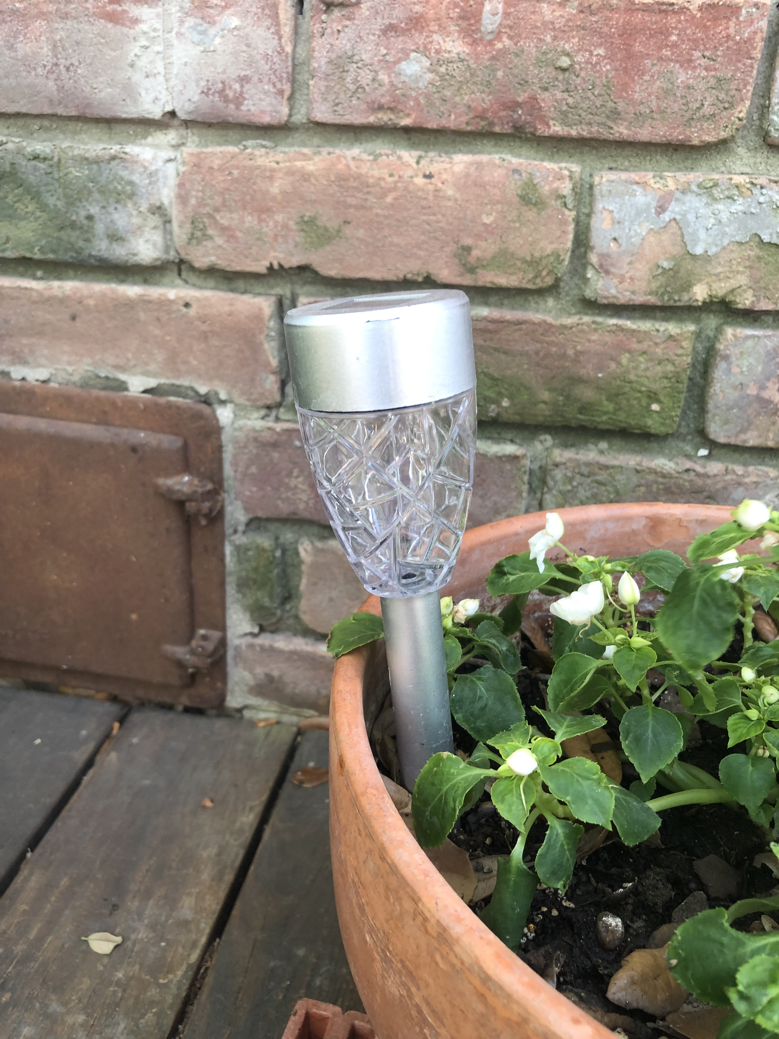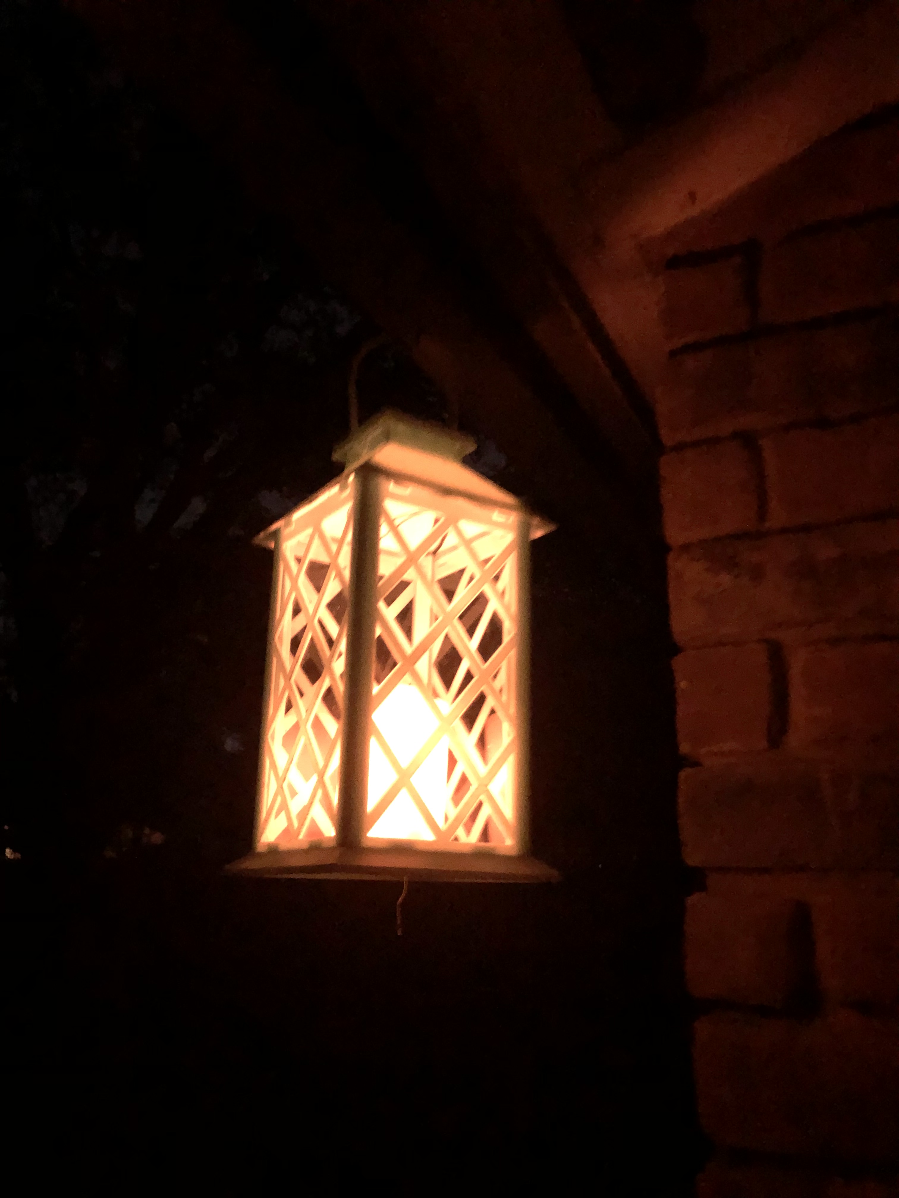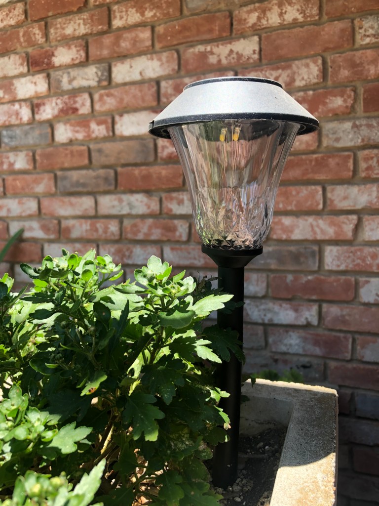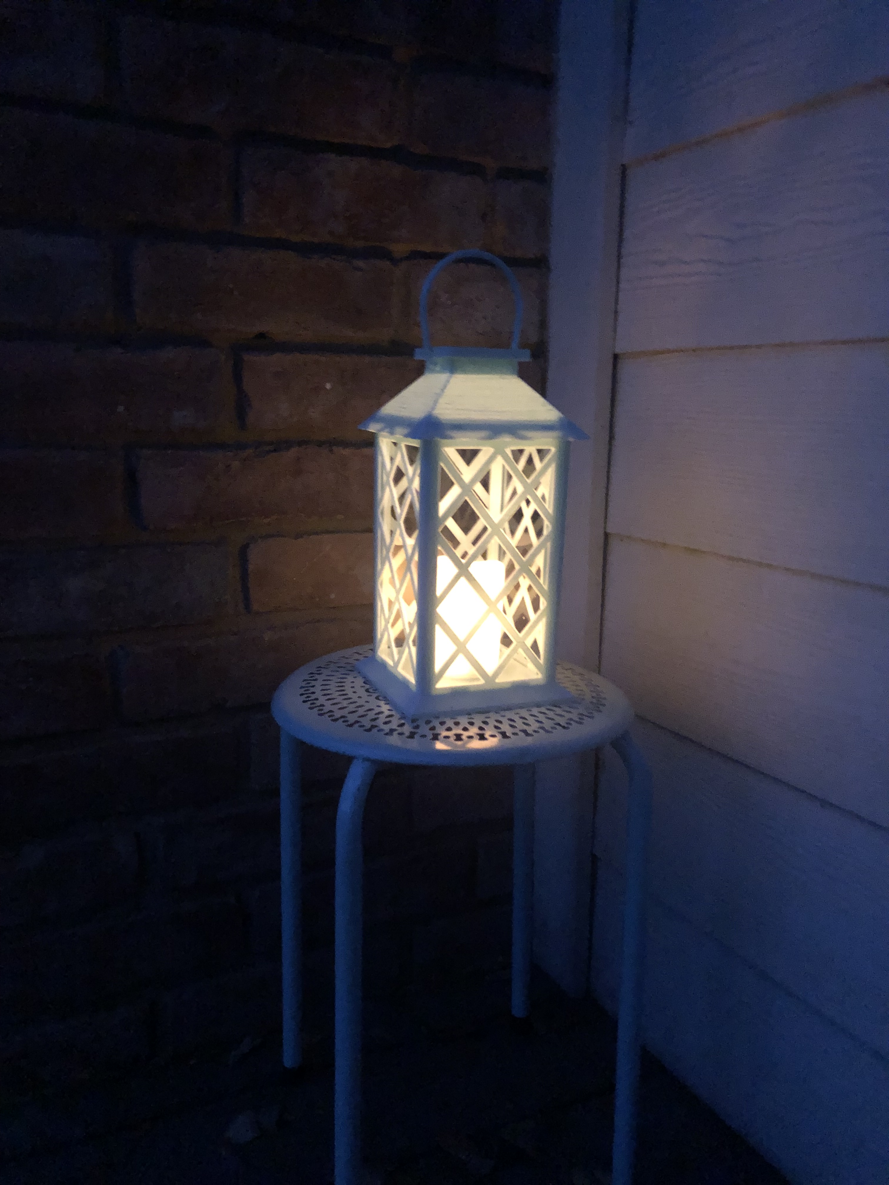 The At Home store provided the answer: 2 $3.99 solar lanterns to put in each of the planters at the front of the porch. Perfect! Just enough soft light to give the porch a little security and if the battery goes out in the garage door opener would allow me to see the lock on the front door!