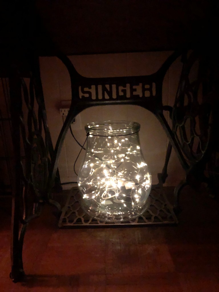 My summer replacement for the garland is this large jar with a wire handle filled with a string of lights. It is unattractive by day, but lovely at night. Just to note the picture doesn’t capture the tiny light spots of the lights reflecting in the jar, but it is very pretty.