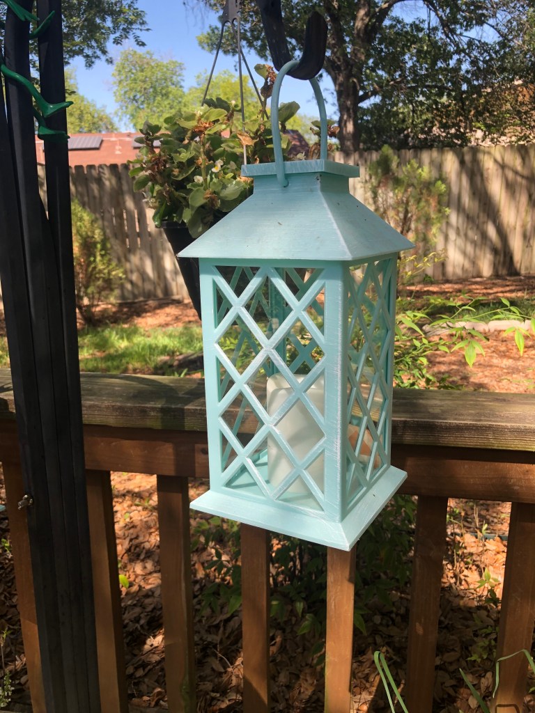 But I wasn’t done yet. After a week or so I decided to go back to DT and get another lantern (this was not the first trip I had made to DT since I bought the table andfirst lantern, just to clarify things). This one I hung on a hook under the eave of the house and even though I liked it there it found a better place hanging on the hanging plant stand.