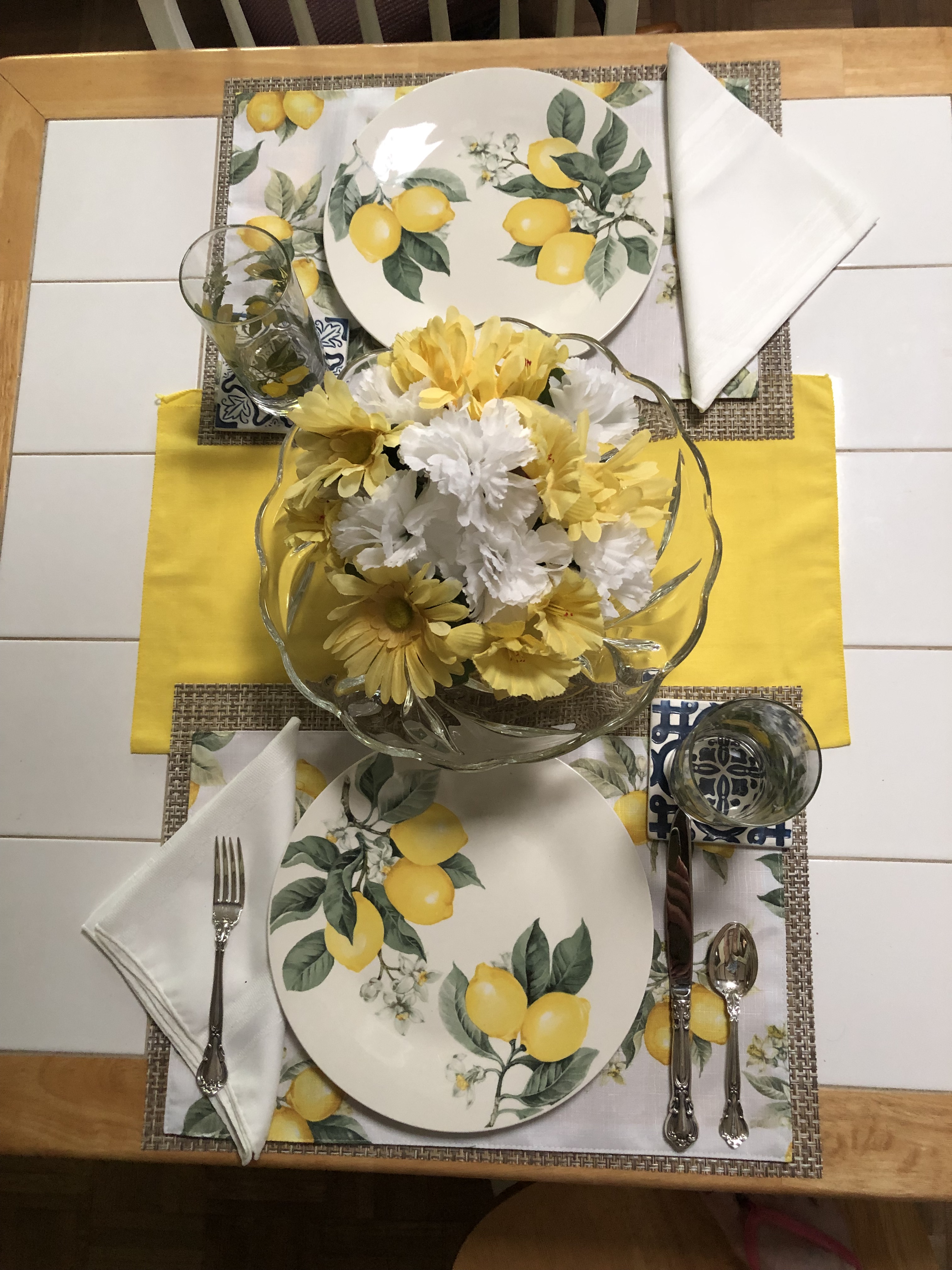 Now to admit, I did have to go back to DT and buy a lemon bowl and flowers to go in it. I tried a candle and greenery and several other arrangements, but the table needed flowers, yellow flowers. The cost was minimal, so they were the only thing I had to buy for the table arrangement.