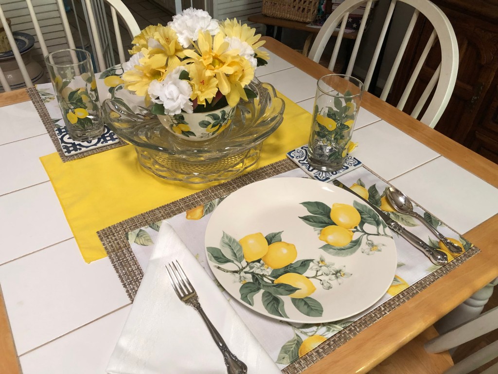Since the plates, placemats, and glasses didn’t cost very much I was determined not to spend anything on the rest of the table items. So I went to work going through what I had on hand and had fun experimenting until I got the “look” I wanted. My parents were Depression Era babies and I was raised with the Depression Era attitude of “Use it up, wear it out, make it do or do without”; for some reason, I felt this attitude was appropriate for the inexpensive DT lemons. .