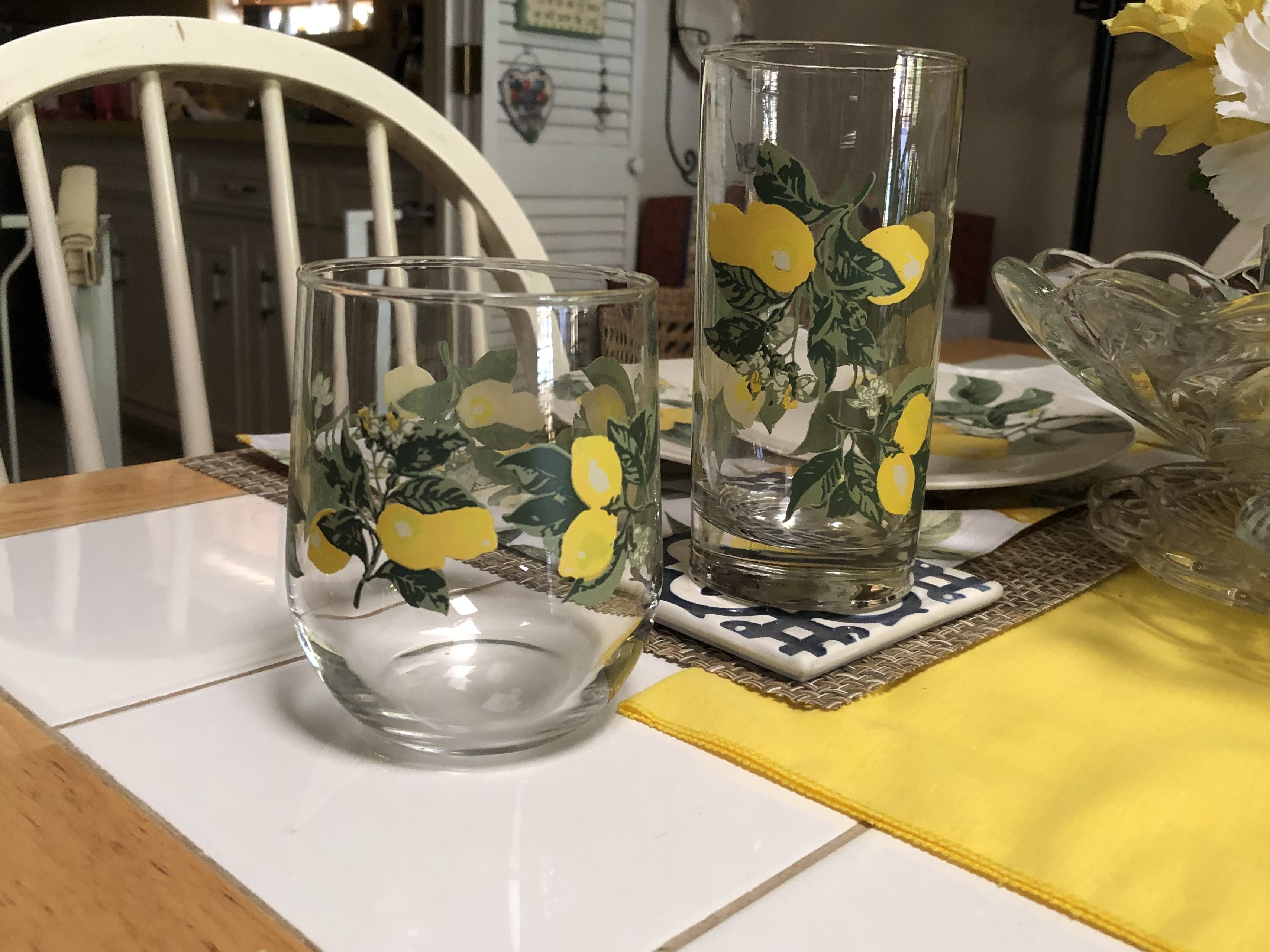 Beth, I think this table setting is beautiful! I love all the yellow – so cheerful! The Chantilly coasters blend nicely with the texture of the woven placemats, and “grounds” the setting. Very nicely done! I’m also glad to know the glasses went through the dishwasher several times and still look good!