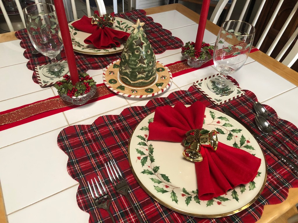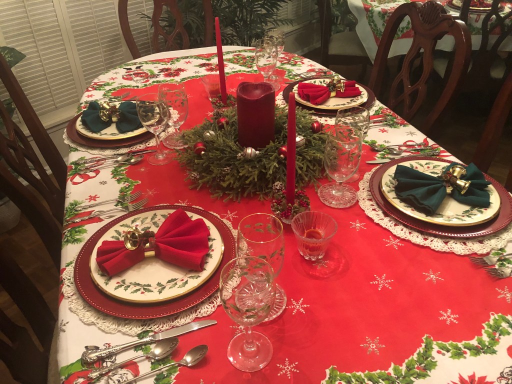 The dinner turned out nice and the tablecloth was a special little perk up for a casual pre-Christmas meal. Just to note, this picture was made after the meal when I reset the table with full flatware and wine goblets. The Lenox Holiday plates are new this year and I’m glad the internet ad for them popped up one day last summer, they were quite a bargain and I was able to buy 8!