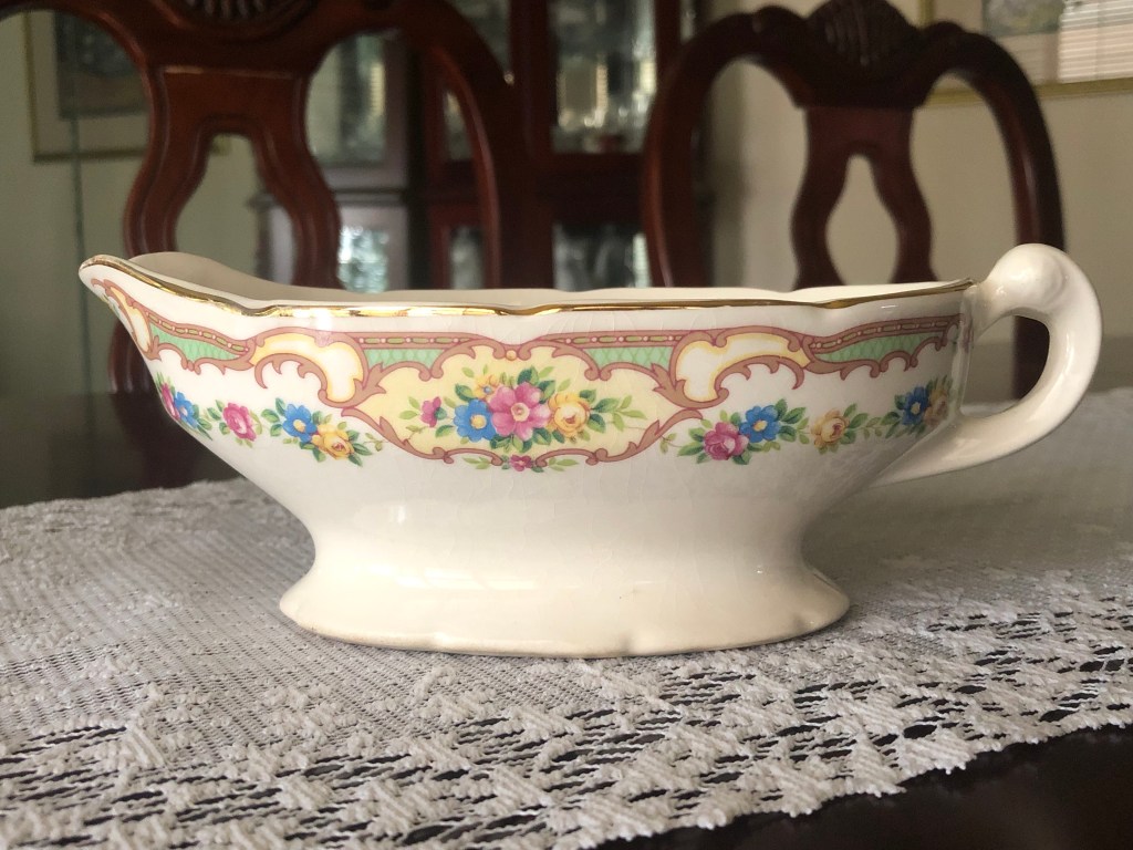 Over the years since I have found and bought a few pieces of the unknown pattern and I’ve left a few behind, too. I’ve picked up a very worn bowl, a well used plate, a creamer in good condition, and my latest find is a gravy boat also in good condition. I spotted it across the store and when I got close , I recognized it and pretty much ran to grab it, thinking “mine, mine, don’t touch it, get away”!