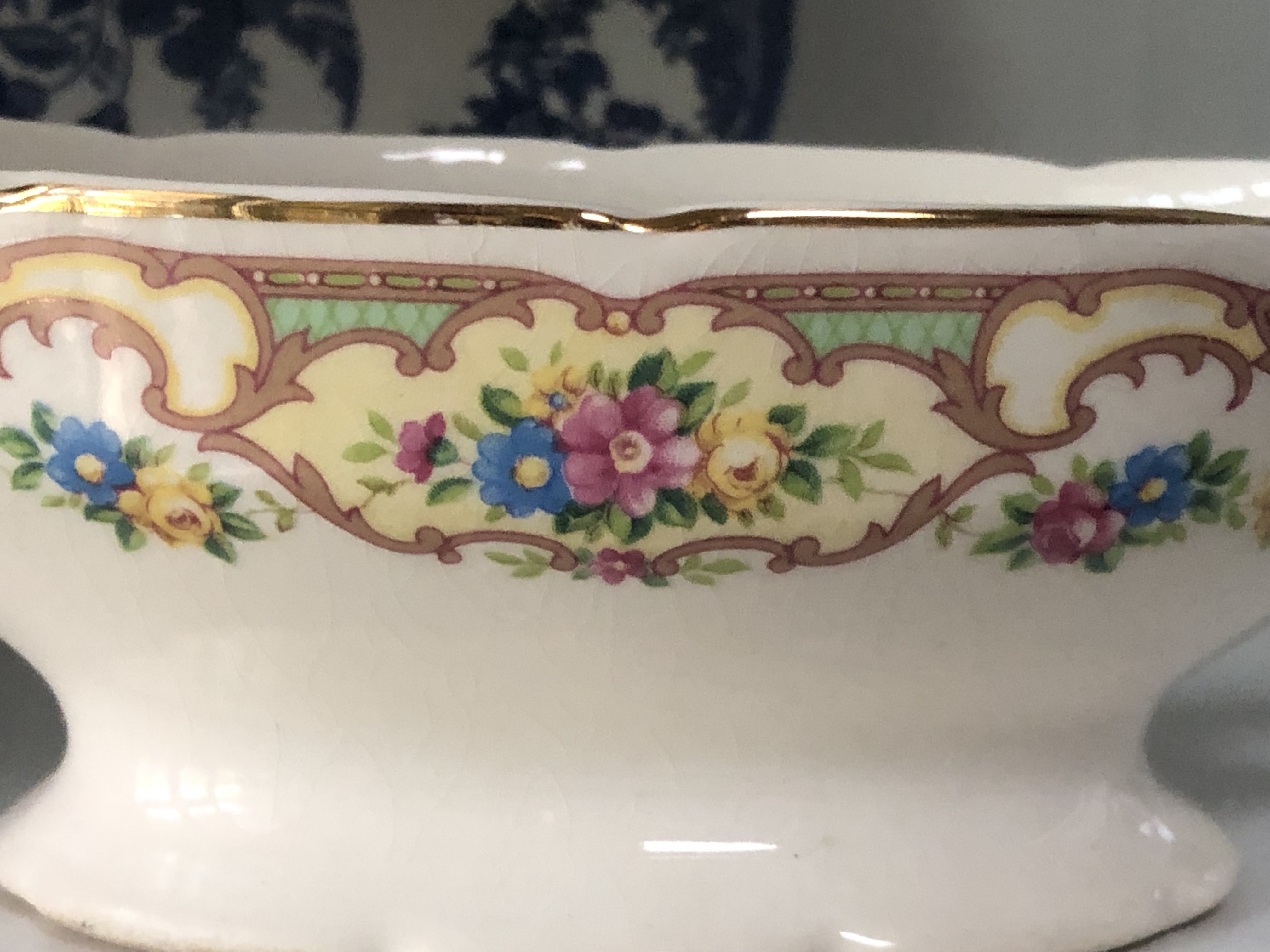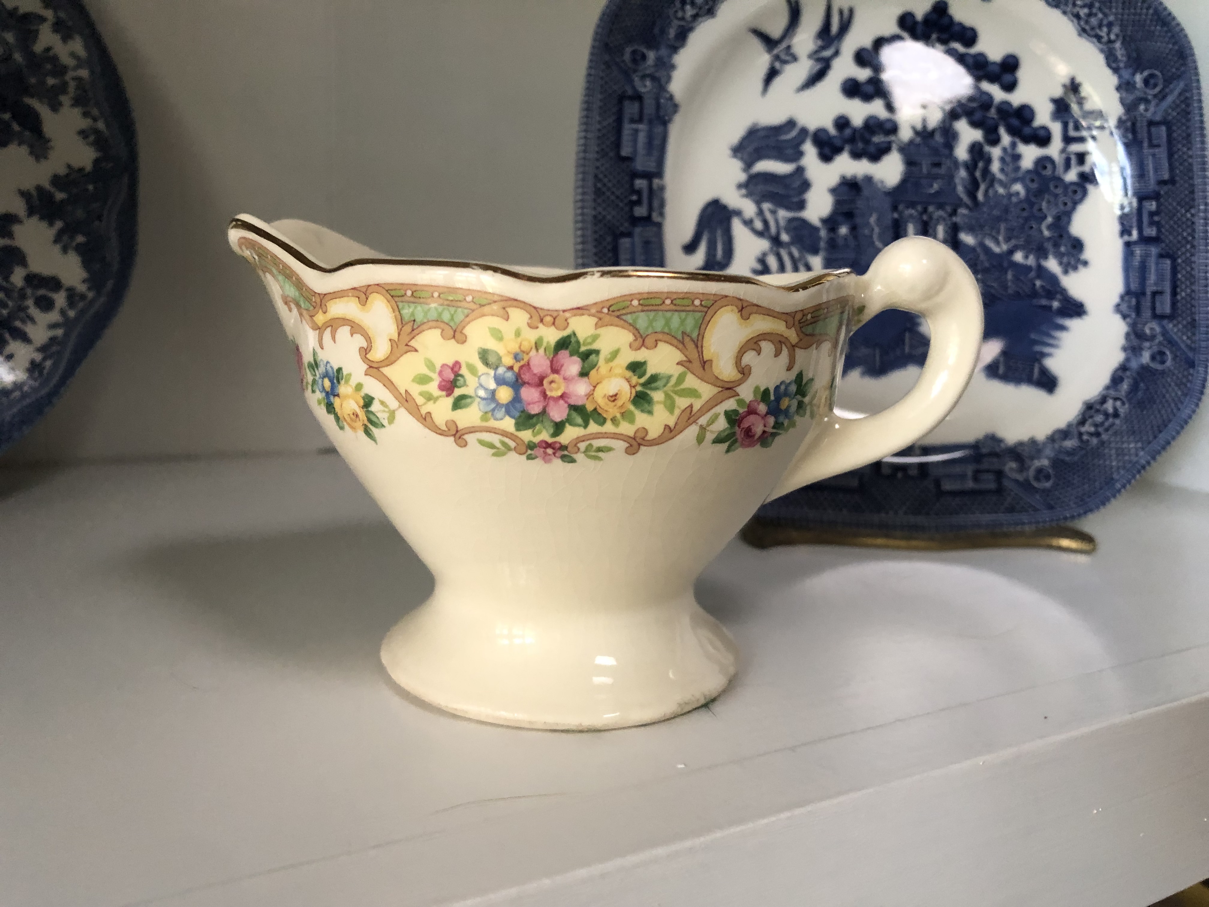 We ate every meal at my grandparents’ house from dishes with this pattern, plates at mealtime, soup and cereal from the bowls as well as homemade ice cream, and we spooned sugar from the well-worn sugar bowl. After bringing the sugar bowl home, I asked my mother if she remembered when my grandmother bought the dishes or what the pattern was as there was no maker’s mark on the back. She was a little puzzled and said she couldn’t really remember anything about it, it was just a part of their home.