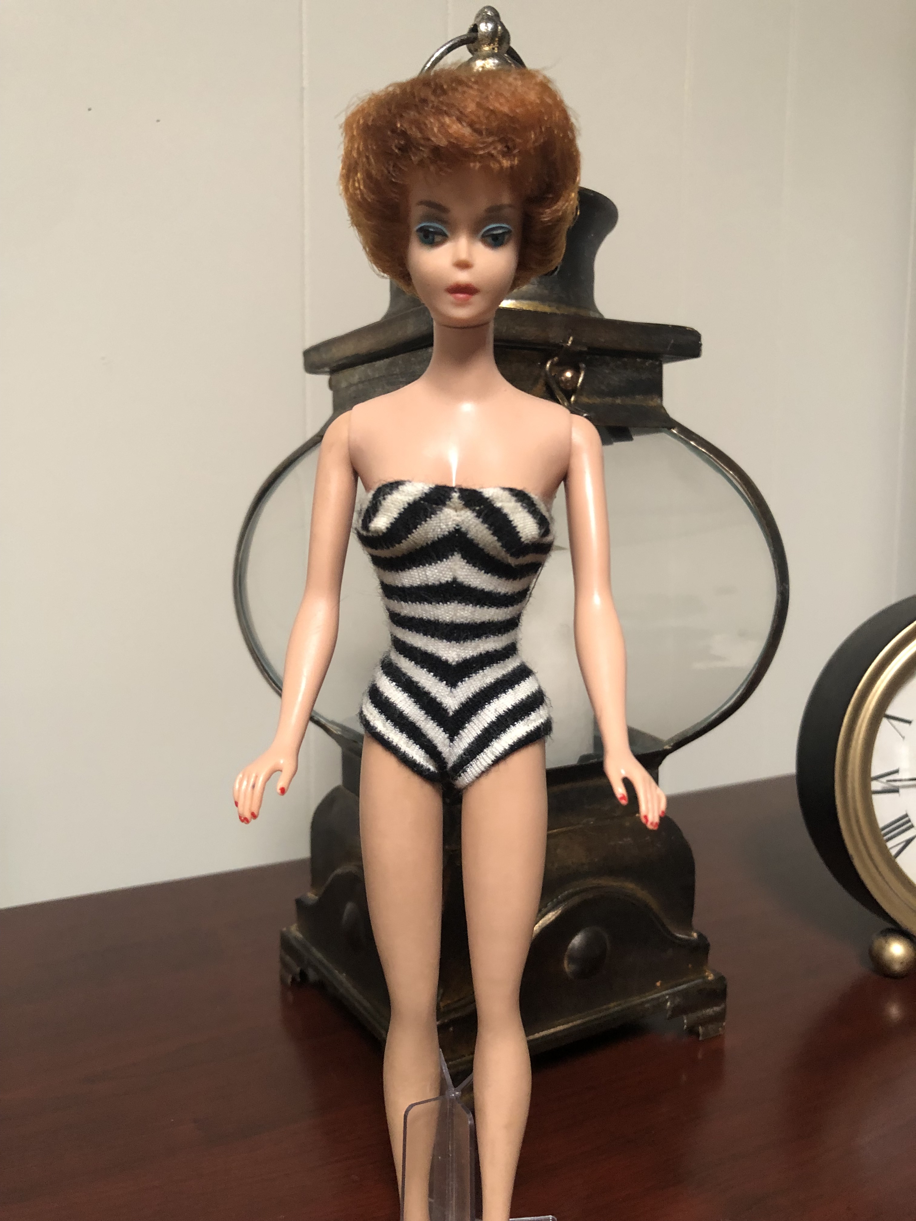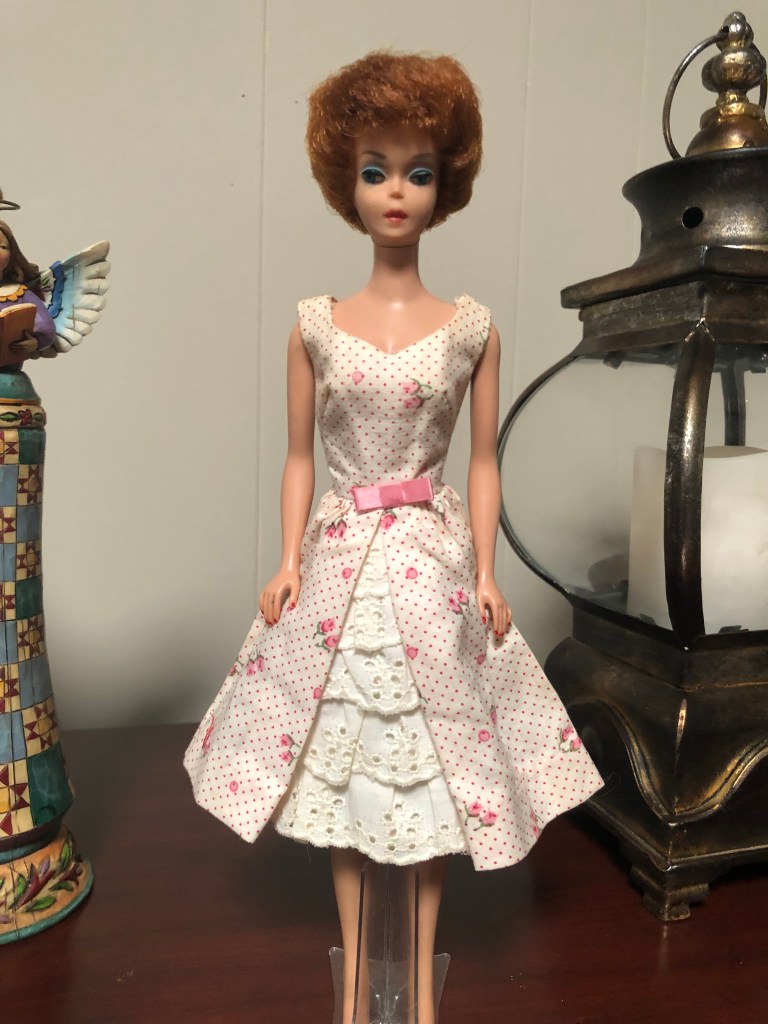 I don’t remember if it was Christmas 1962 or 1963, but Santa left me a Barbie doll under the tree. A Barbie with Titian red hair in a bubble cut and a strapless black and white swimsuit. I didn’t know what a Barbie doll was, but I quickly learned! In time, I acquired a few more dolls and cases, and of course, a modest amount of clothes. My parents didn’t lavish toys on me like some parents so I never had a Barbie house or car. My mother bought a pattern and duplicated many of the outfits I wanted.