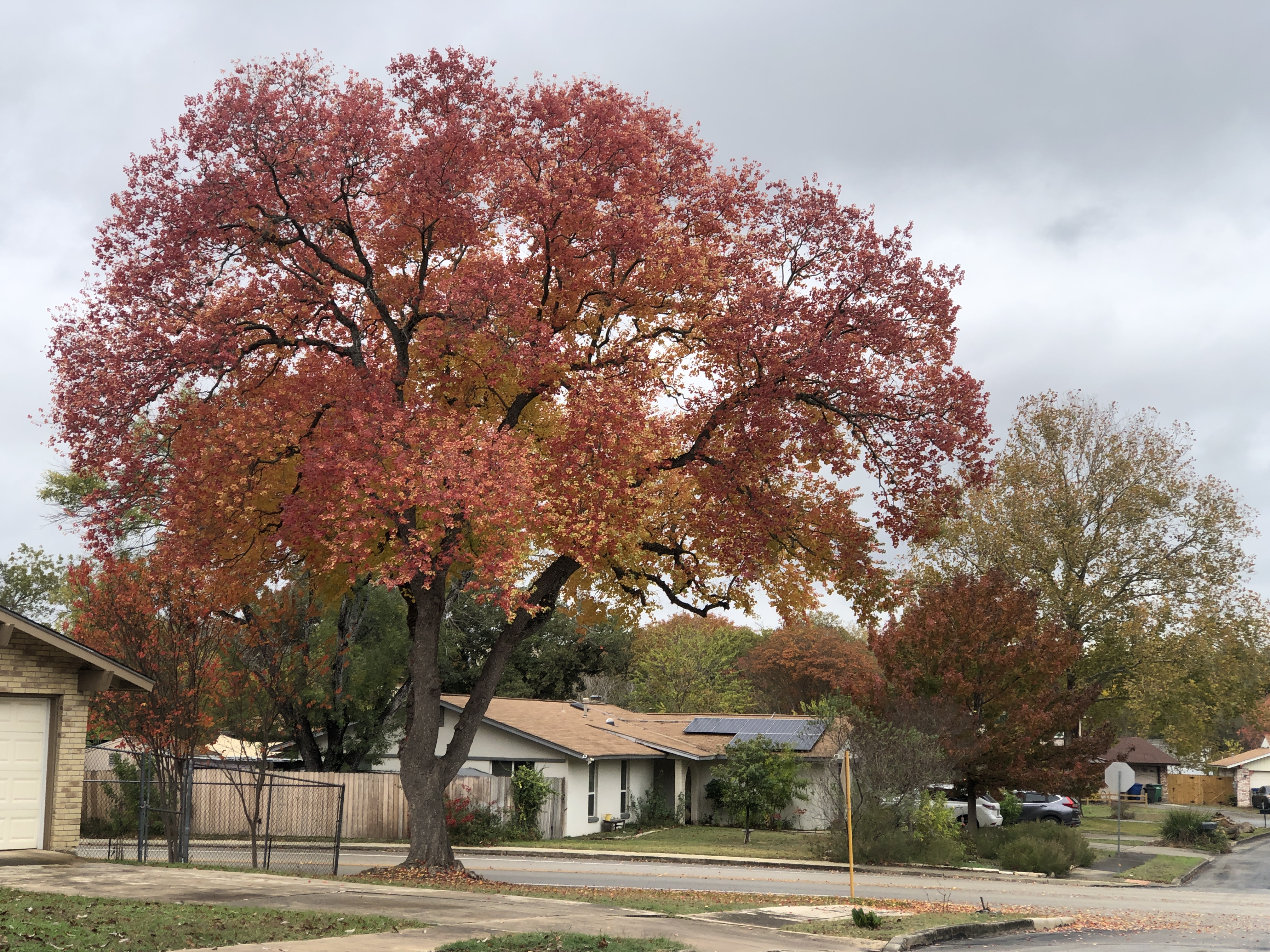 The leaves were not as brilliant as they usually are, probably due to the drought and lack of rain. These trees are now bare and the yards, sidewalks, and street are covered with the leaves of many colors.